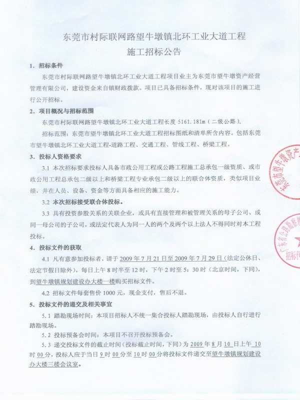 东莞市村际联网路望牛墩镇北环工业大道工程施工招标公告