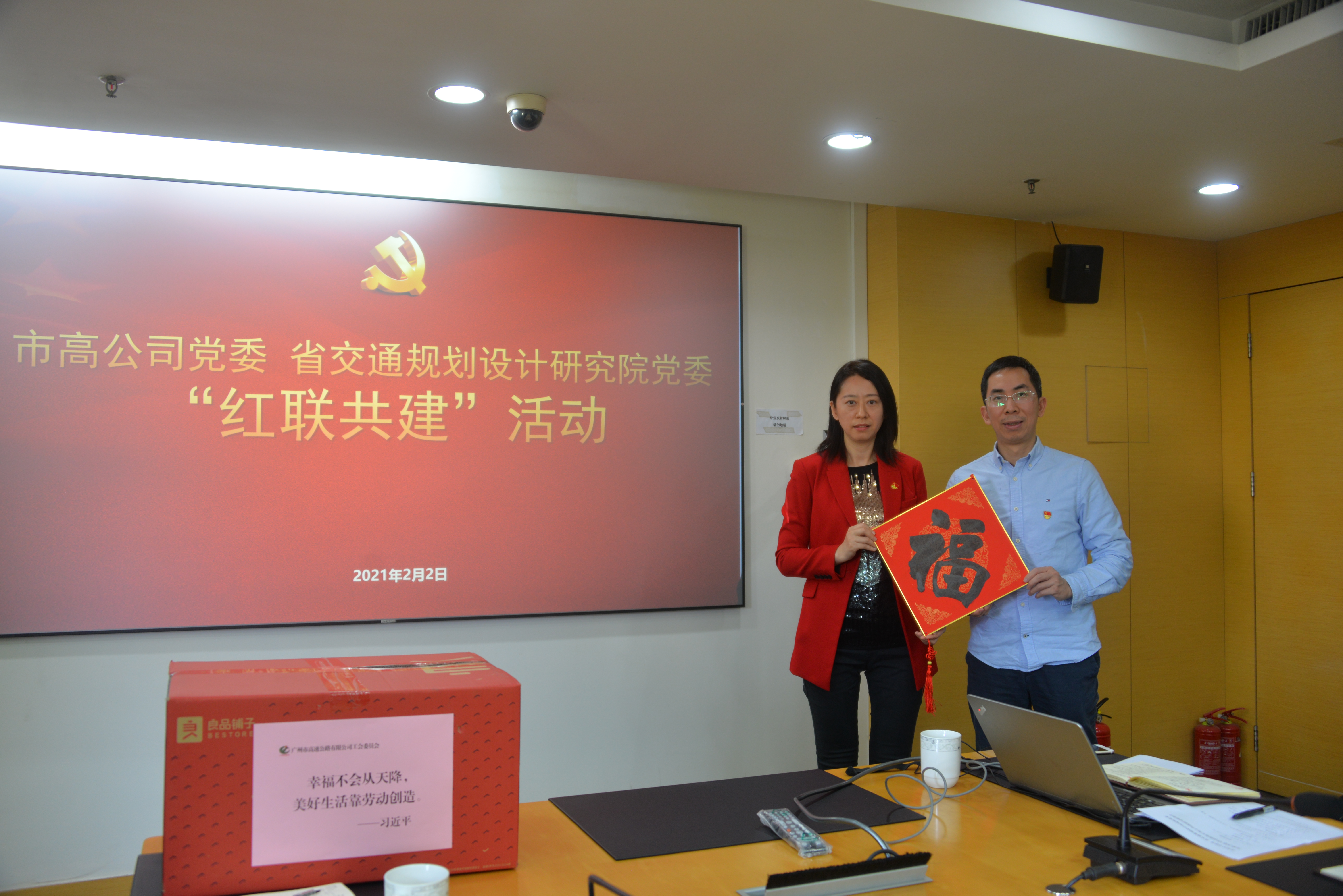 基于疫情防控形势需要,我公司增天项目组还与市高公司深入讨论了增天高速项目组春节值守、留穗过年安排等事项。市高公司送上员工亲笔书写的“福”字,作出留穗过年倡议,希望双方度过一个祥和愉快的春节,新的一年继续推动增天高速设计工作实现新突破。市高公司党委副书记、工会主席刘媛媛还对我司一年来在增天高速项目设计工作中付出的努力表示了衷心的感谢,并对增天高速2020年取得的业绩表示了充分肯定。日后,双方将珍视“红联共建”平台,通过创新活动形式、丰富共建内容,进一步发挥党建工作对项目中心工作的促进作用,共同打造增天高速项目品牌亮点。