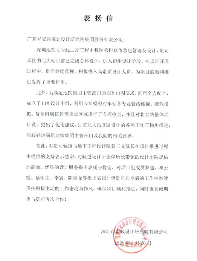 近日,项目总体单位深圳市市政设计研究院有限公司发来表扬信,对我公司在深圳地铁七号线二期工程北大站项目的总体设计、初步设计以及BIM设计等各项工作中所展现的高质量专业技术水平和高素质设计服务水平给予了充分肯定,并点名表扬了具体负责该项目的团队组成员。