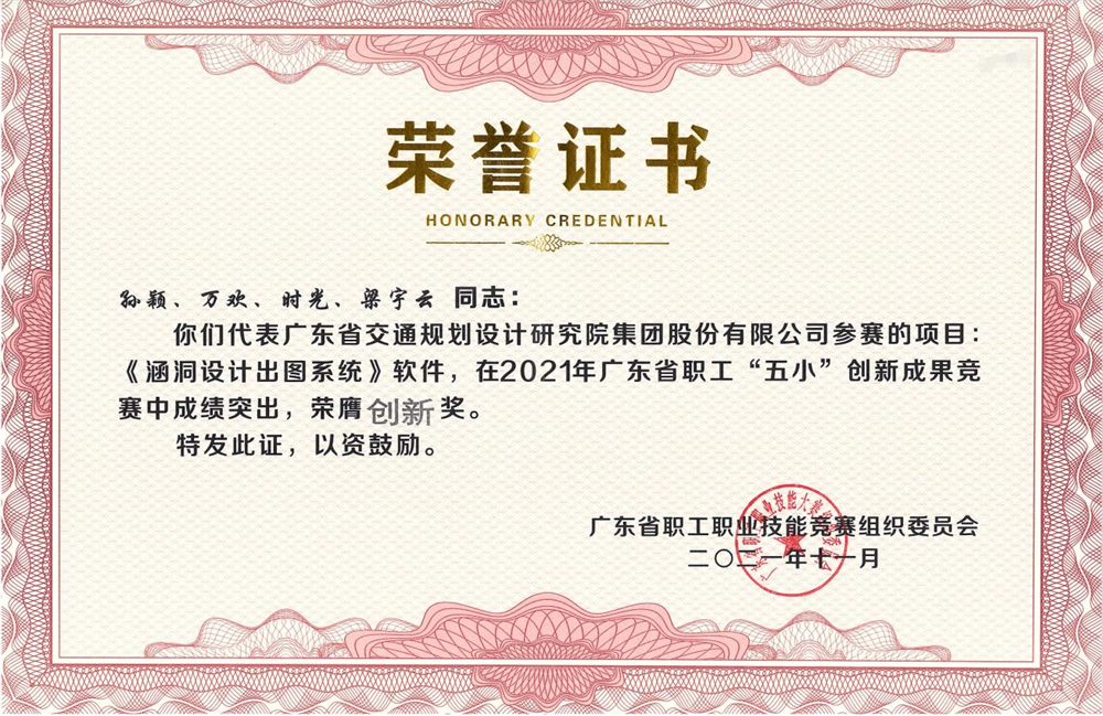 11月23—24日,2021年广东省职工“五小”创新成果竞赛决赛暨总结大会在广州举行。本次竞赛由广东省总工会、广东省人力资源和社会保障厅、广东省工业和信息化厅、广东省科学技术厅主办,广东省总工会职工技术协作中心、广东省质量协会、广州市质量协会承办。经过激烈的角逐,公司数字化技术研究院研发的《涵洞设计出图系统》软件荣获创新奖。