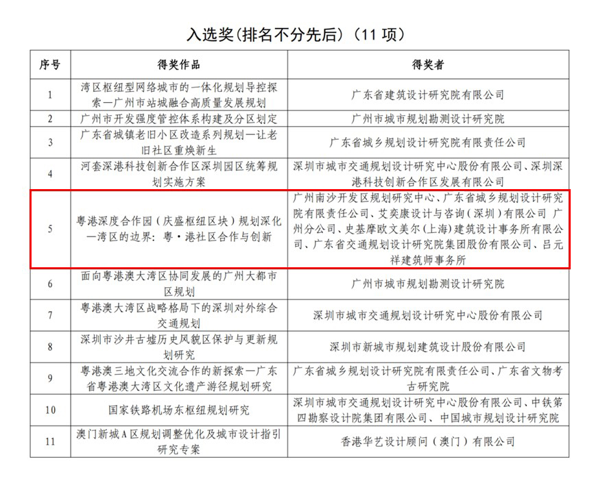 近日,由香港规划师学会主办的大湾区规划大奖2022(The HONGKONG INSTITUTE OF PLANNERS GREATER BAY AREA PLANNING AWARDS 2022)获奖名单公布。集团联合广州南沙开发区规划研究中心、广东省城乡规划设计研究院有限责任公司等单位编制的《粤港深度合作园(庆盛枢纽区块)规划深化-湾区的边界:粤·港社区合作与创新》项目在大湾区200余个参赛项目中脱颖而出,荣获入选奖。