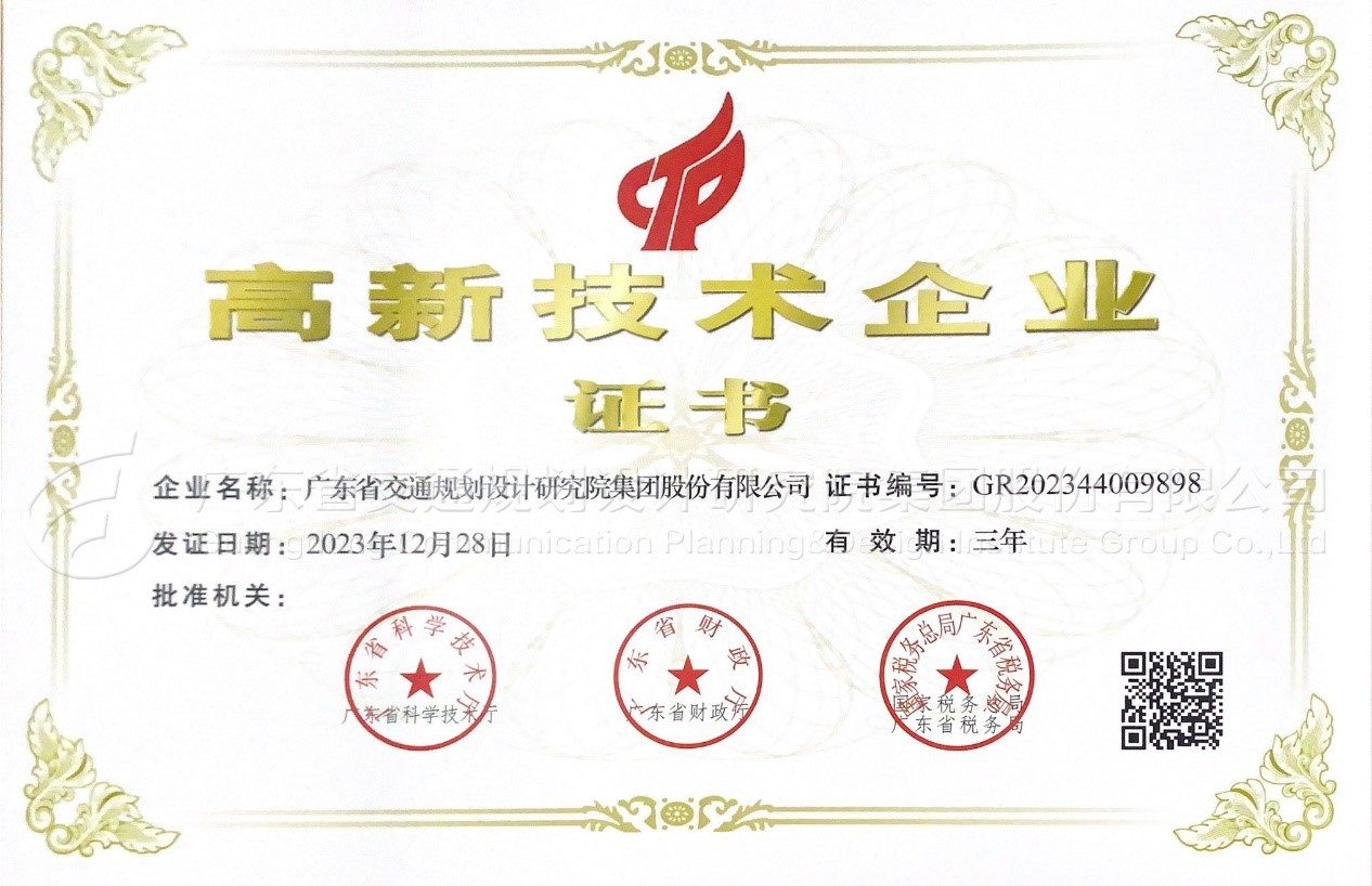 公司自2008年首次认定为国家高新技术企业,每三年顺利延续认定至今。一直以来,我们坚持以创新驱动发展,不断完善科研平台建设,强化企业核心竞争力。目前,公司设有国家博士后科研工作站、广东省工程技术研究中心(下设高性能土木工程结构联合创新研究中心)、广东省企业技术中心、广东省及环粤地区交通规划与仿真实验室、梁立农创新工作室、数字化技术研究院、智慧交通创新与应用研究中心、交通大数据研究中心等科研创新平台,在开展工程技术攻坚的同时,积极进行BIM、GIS、5G、大数据等工程数字化、智慧化技术的研究和应用,不断探索新理念、新技术、新模式。