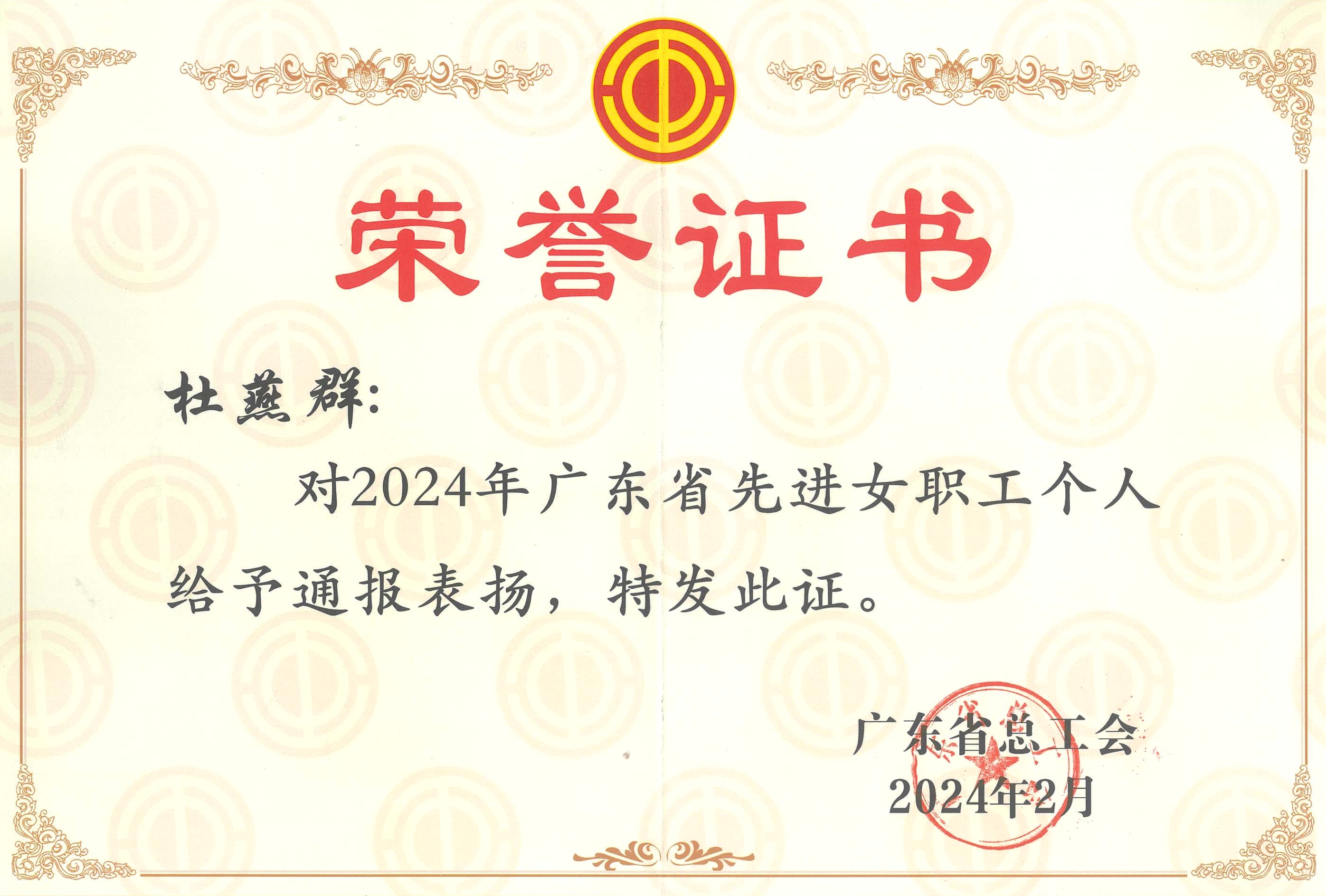 近日,从广东省总工会传来喜讯,公司副总工程师杜燕群获广东省总工会授予“2024年广东省先进女职工个人”荣誉称号,特此报喜。