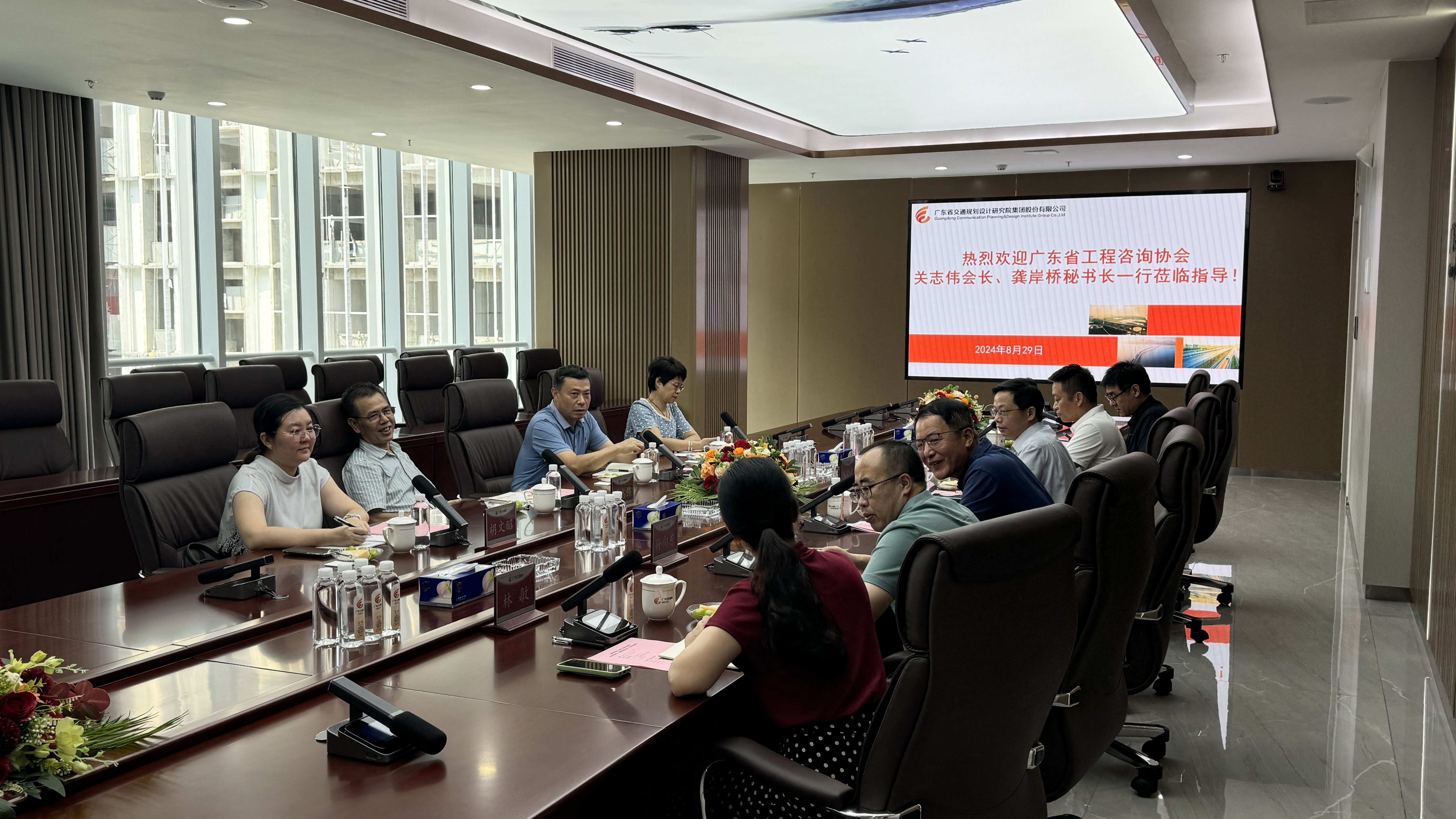 8月29日,广东省工程咨询协会会长关志伟、秘书长龚岸桥一行莅临公司座谈交流。公司董事长李江山,副总经理陈贤文,总工程师孙向东,总经理助理、九域公司总经理朱青,市场发展部主任邬晓辉,科技质量部主任林敏参加了交流会。
