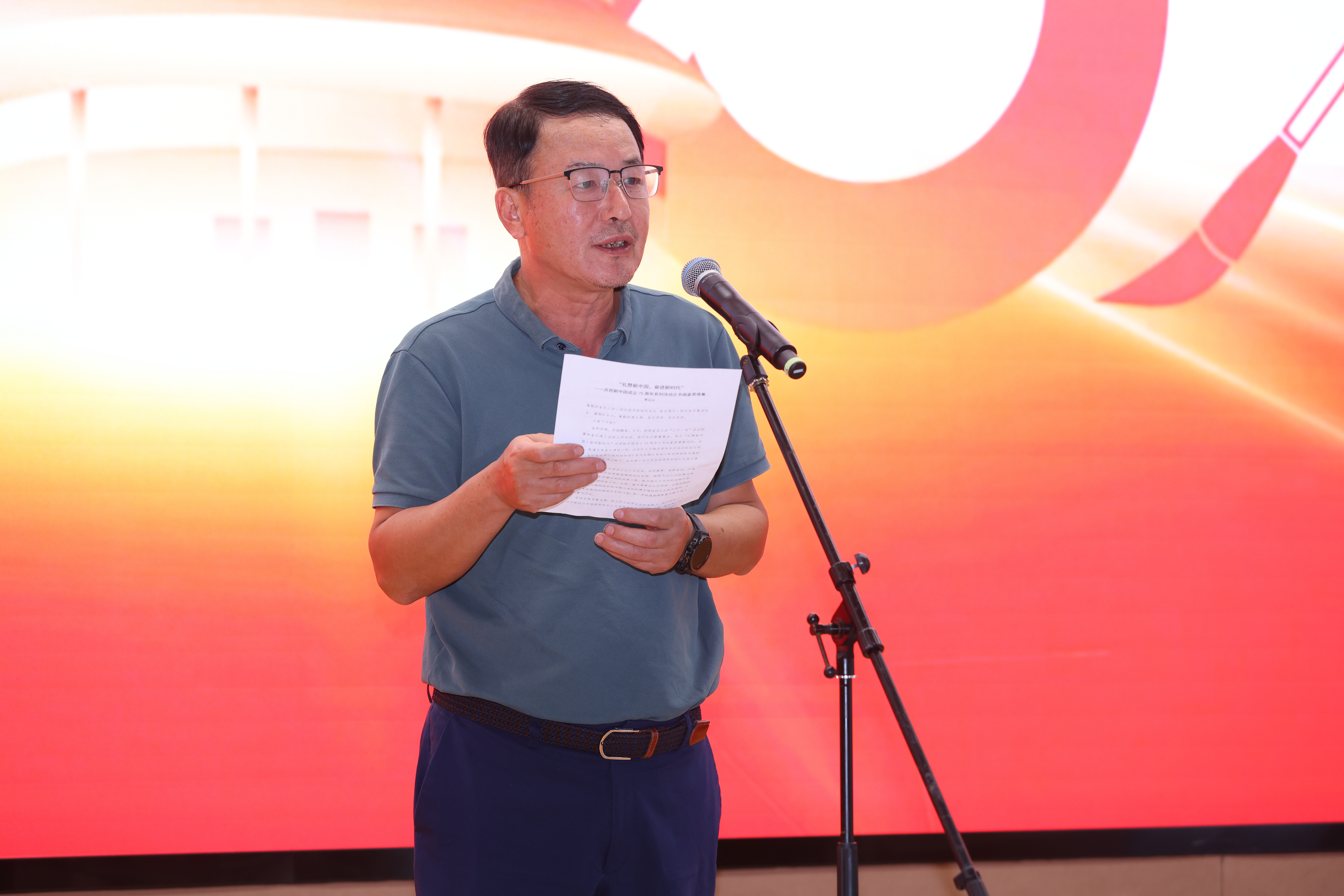 翰墨丹青颂经典,以文会友谱华章。广州美术学院谭文选老师以其深厚的艺术造诣和生动的讲解方式,为现场观众带来了一场别开生面的书法鉴赏授课,使大家从中领略了书法艺术的独特魅力。活动中还穿插了书法献礼环节,谭老师现场挥毫泼墨,创作了一幅寓意深远的书法作品,在祖国母亲75岁生日之际,向祖国献上最真挚的祝福,祝福祖国繁荣昌盛,祝福人民幸福安康。