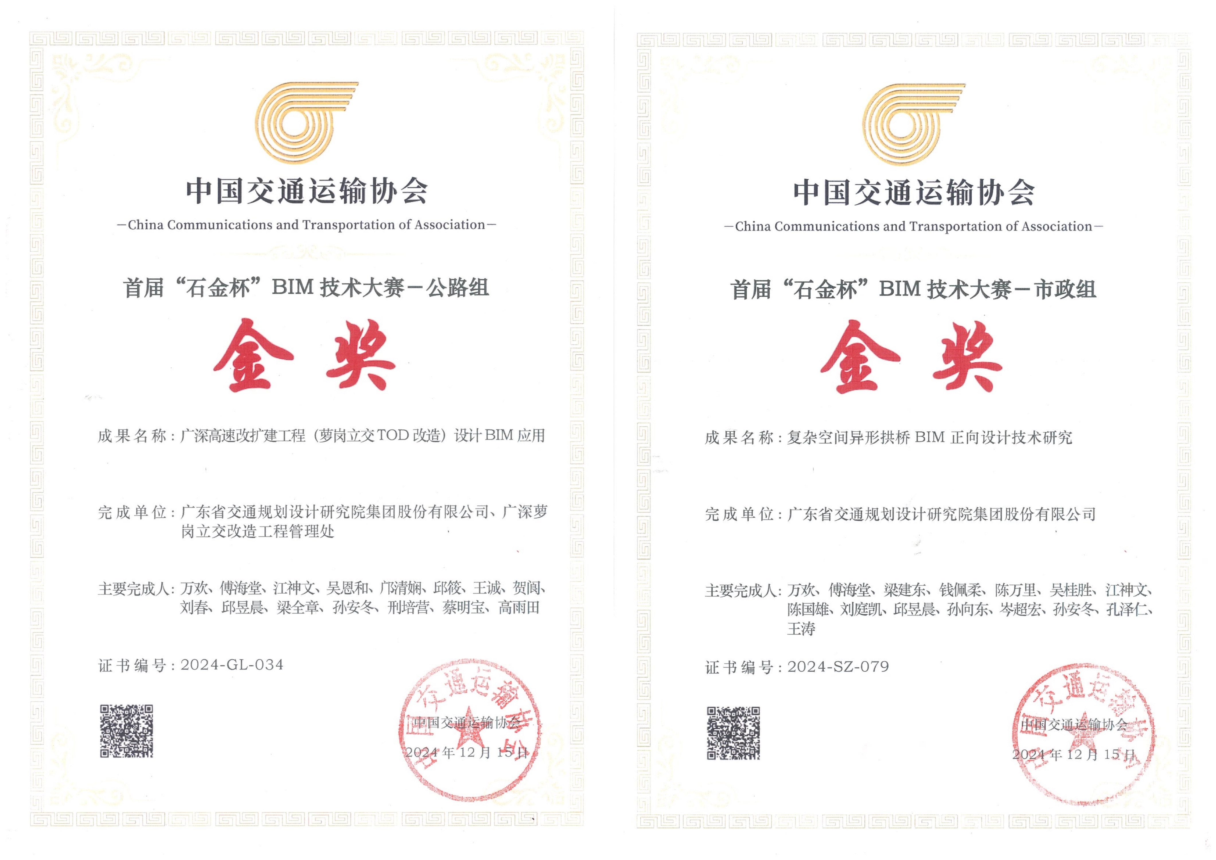 12月15日,中国交通运输协会首届“石金杯”BIM技术大赛颁奖典礼在西安市隆重召开。经过初赛和决赛现场答辩,公司《广深高速改扩建工程(萝岗立交TOD改造)设计BIM应用》和《复杂空间异形拱桥BIM正向设计》在500多个项目中脱颖而出,分别荣获公路组金奖和市政组金奖。