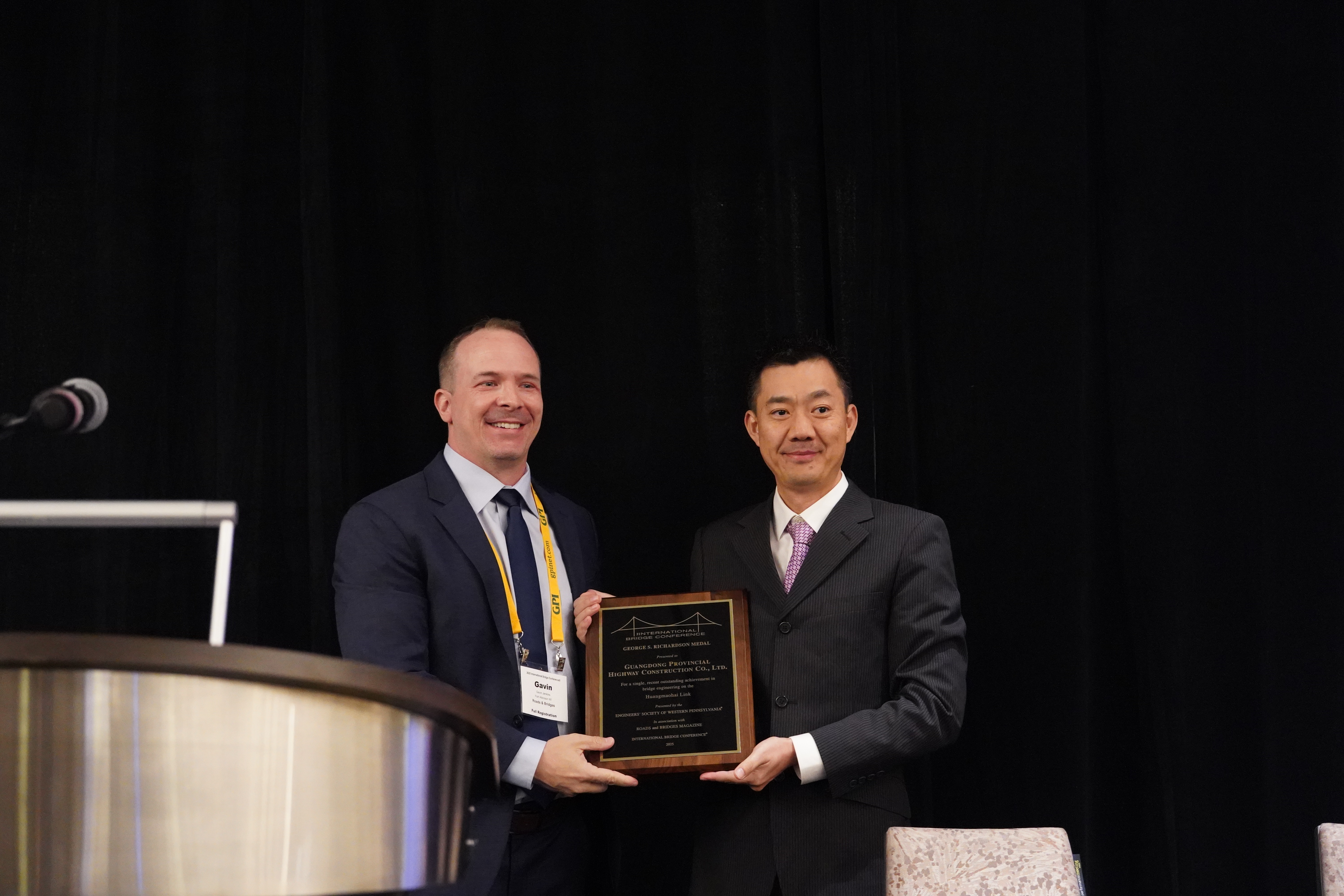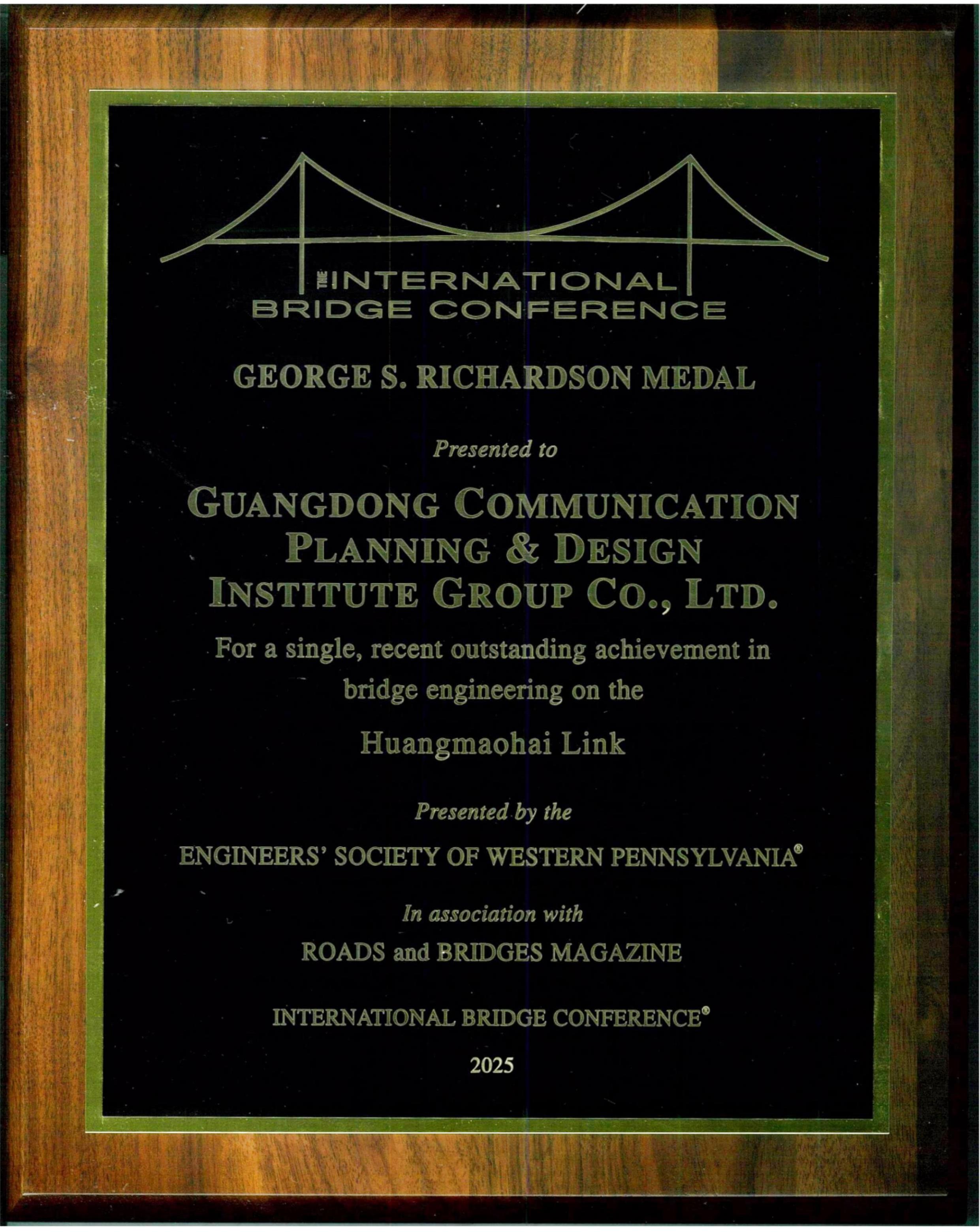 近日,公司承担的黄茅海跨海通道项目荣获2025年乔治•理查德森奖(GeorgeS.Richardson Medal),成为本届我国唯一获此殊荣的项目。作为获奖单位,公司受邀参加了2025年7月14日-16日(美国当地时间)在宾夕法尼亚匹兹堡举行的第42届国际桥梁大会(International Bridge Conference,简称IBC),公司第四设计院总工程师徐德志作为公司代表参加了大会并领取了奖项。