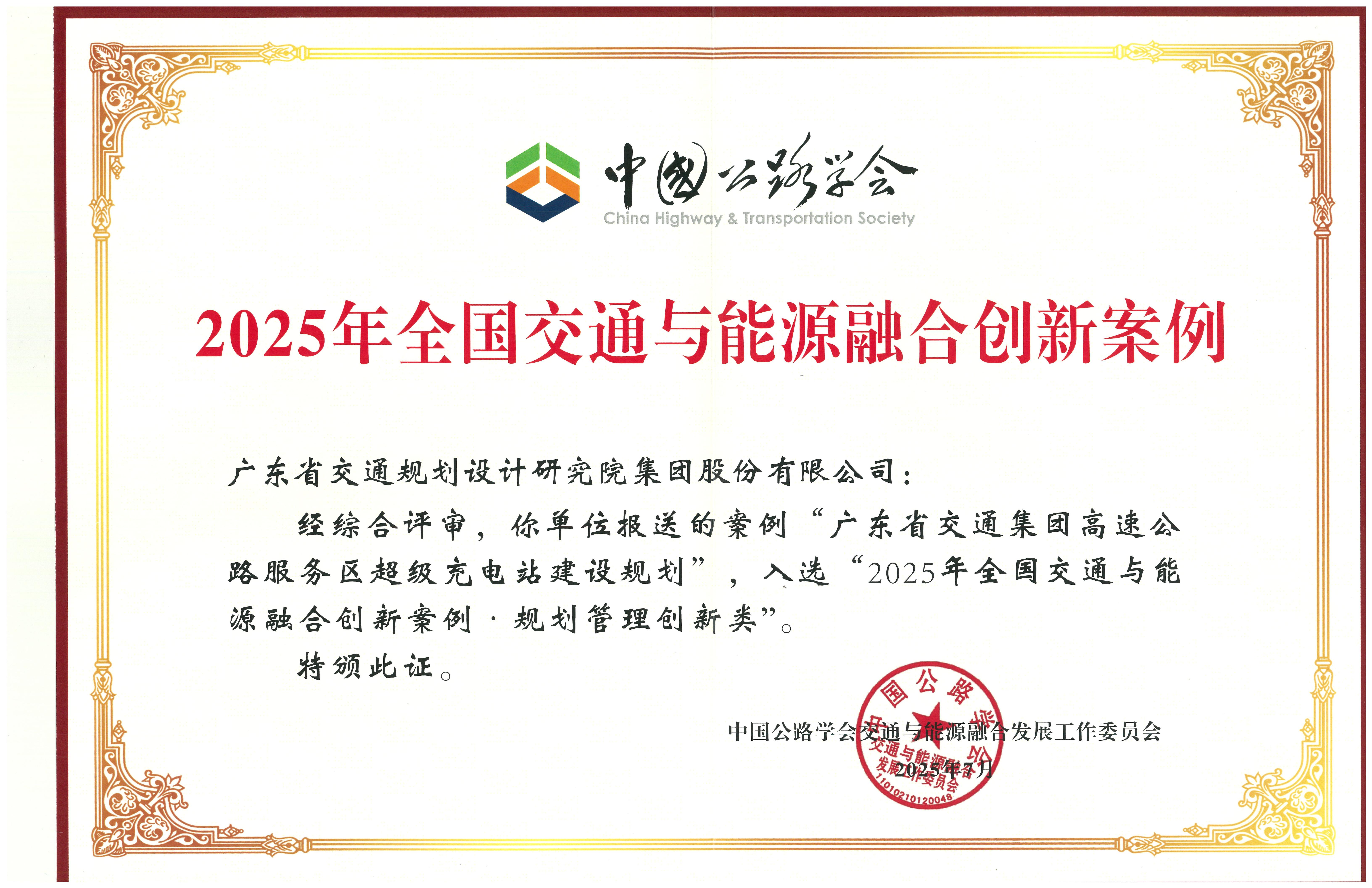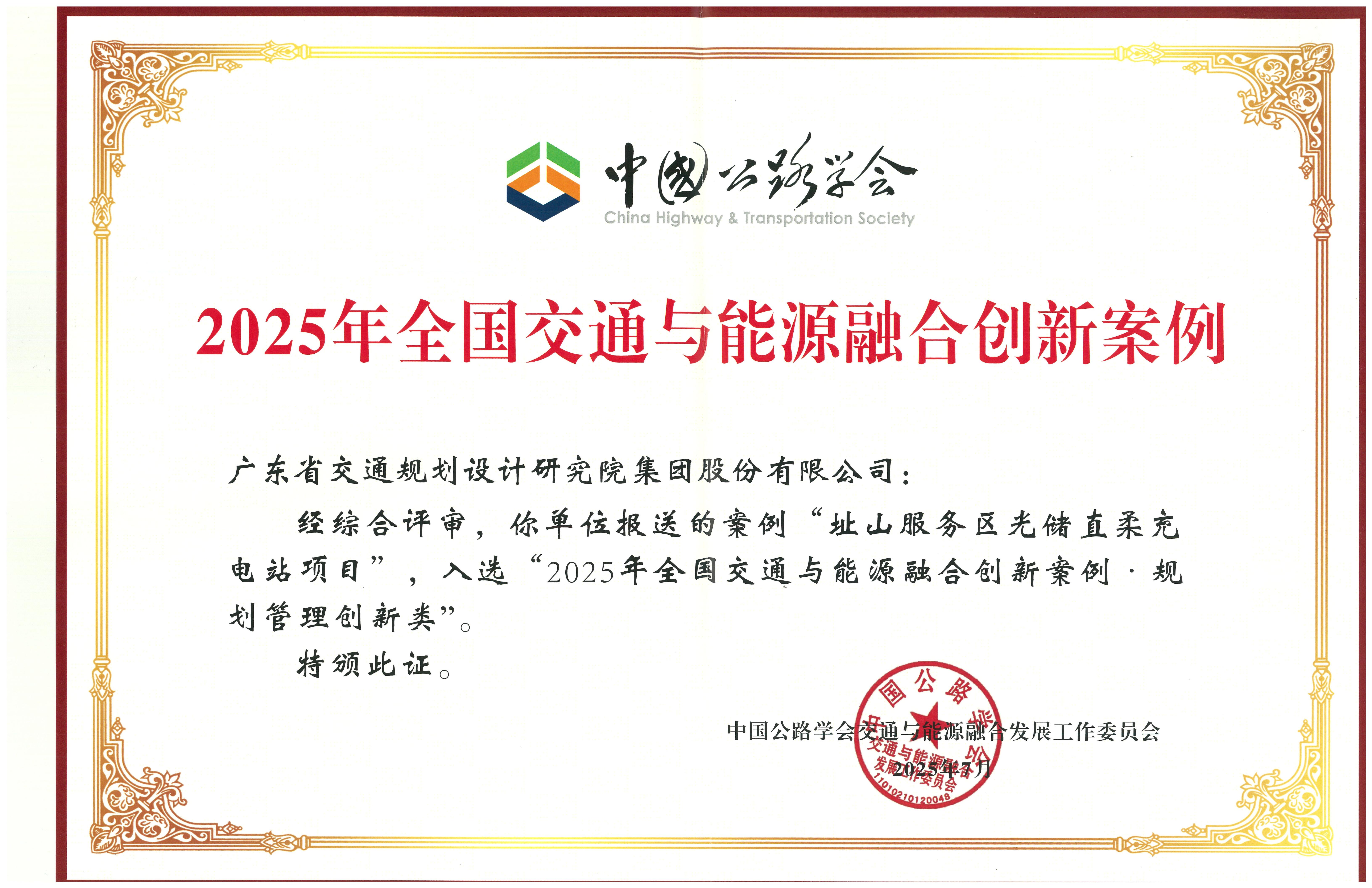 本届年会以“绿色引擎 数智驱动”为主题,共同擘画交通与能源深度融合发展的新蓝图,集中展示我国交能融合领域最前沿的研究成果、实践标杆与权威洞见。会议期间,组委会正式发布了“2025年全国交通与能源融合创新案例集”,此次全国共有64项优秀项目入选,其中公司《广东省交通集团高速公路服务区超级充电站建设规划》《惠大高速元山服务区“光储充”一体化低碳示范项目》《址山服务区光储直柔充电站项目》三个项目入选。