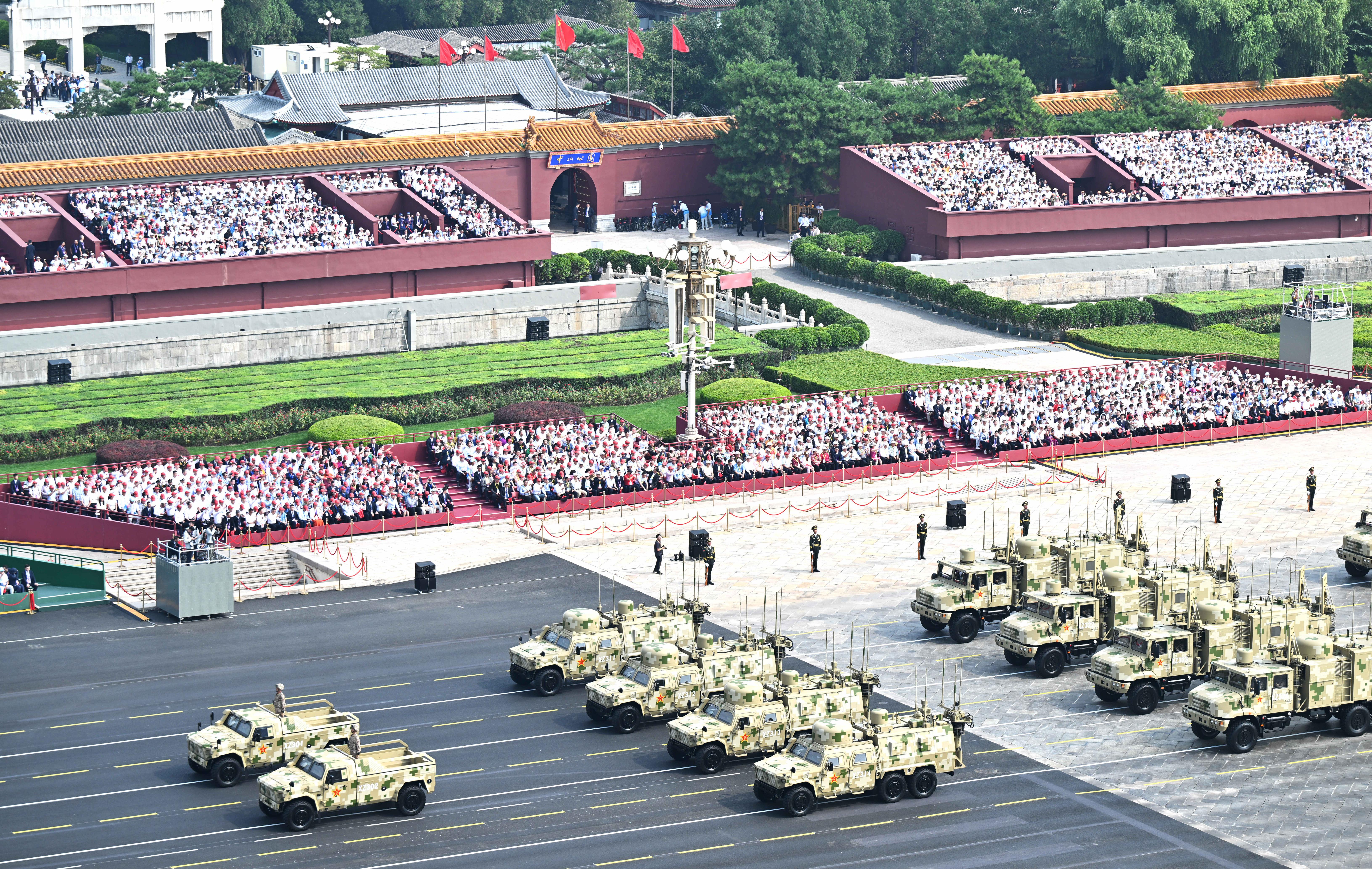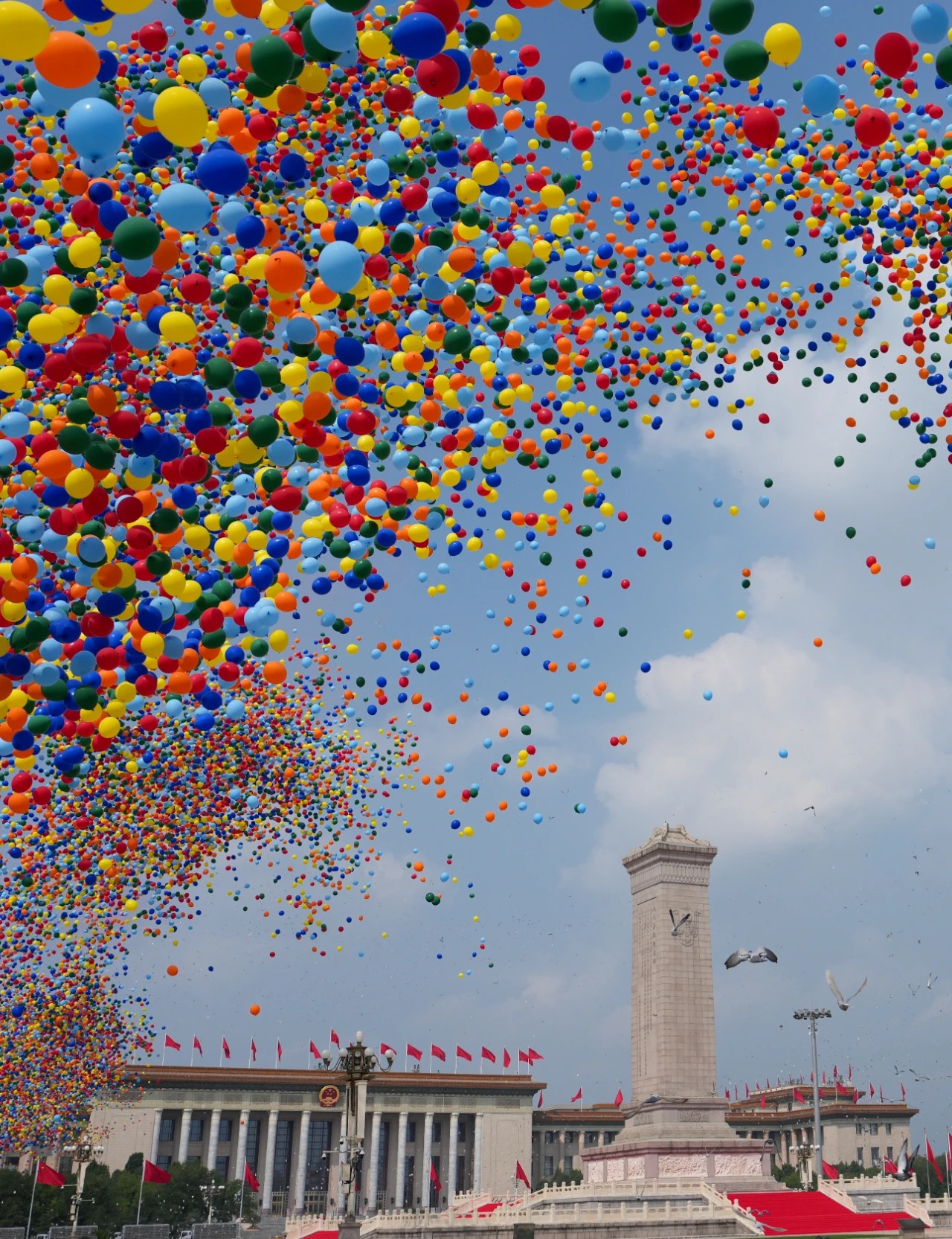 天安门广场上,长城烽火台造型的年号台巍然矗立,象征着中国人民在抗战烽火中用血肉之躯筑起的钢铁长城。14只展翅欲飞的和平鸽雕塑,默默诉说着中华民族14年艰苦卓绝的抗战历程。丰饶金、城墙红、橄榄绿三种主色调交相辉映,寓意着国家的根基在人民、血脉在人民、力量在人民。阅兵活动按照阅兵式、分列式两个步骤进行。中共中央总书记、国家主席、中央军委主席习近平发表重要讲话并检阅部队,这一刻,历史与当代在此交汇,光荣与梦想在此传承。