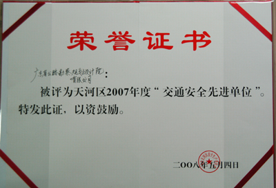 2007年,在公司领导的正确领导和全体员工的共同努力下,我司狠抓公务车行车安全工作,实现全年安全行车无事故,安全行车里程达140余万公里,近日,被广州市天河区安全生产委员会授予“2007年度交通安全先进单位”称号,特此报喜。
