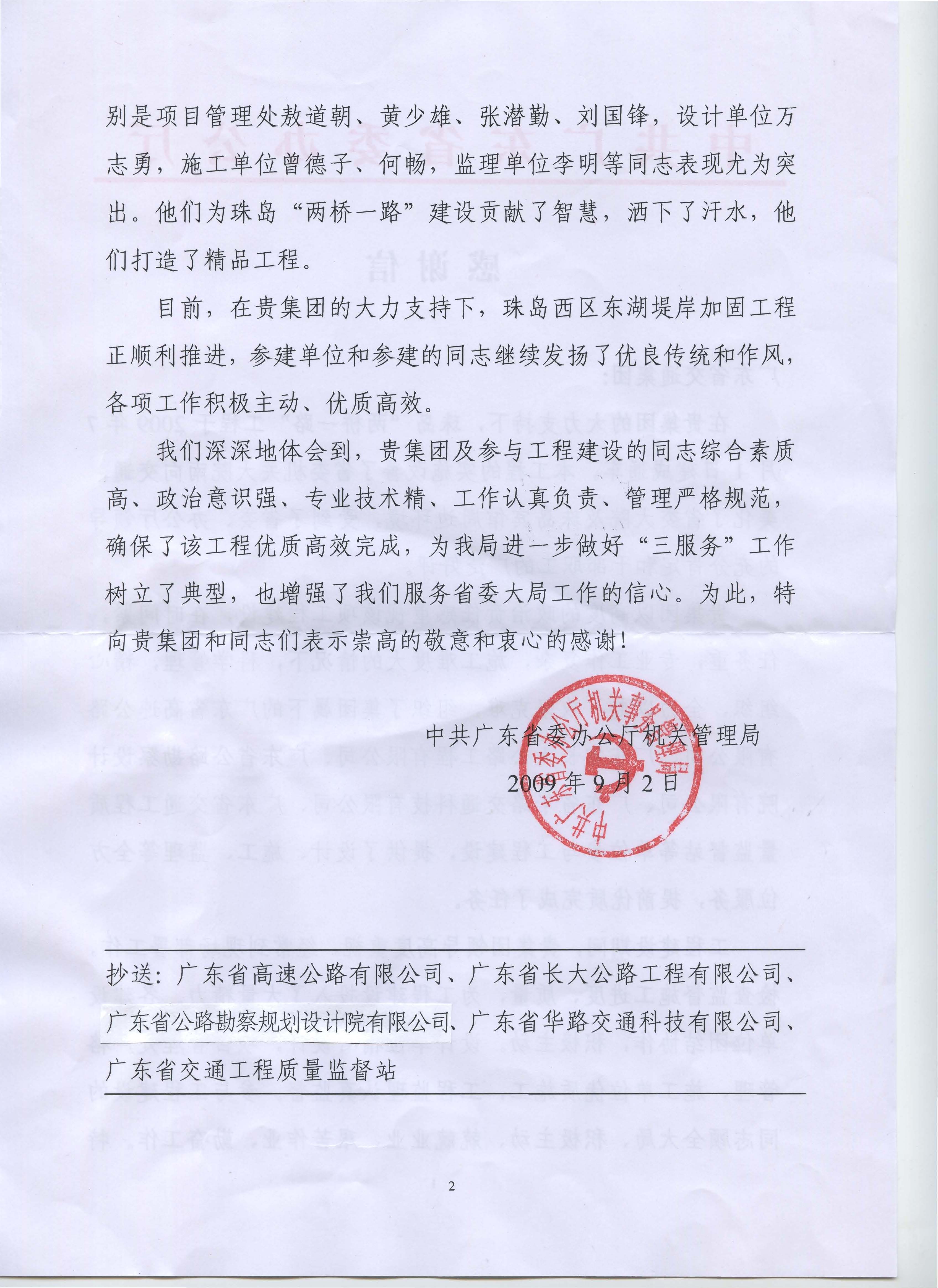 省委办公厅机关管理局关于珠岛“两桥一路”工程的感谢信