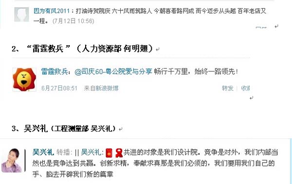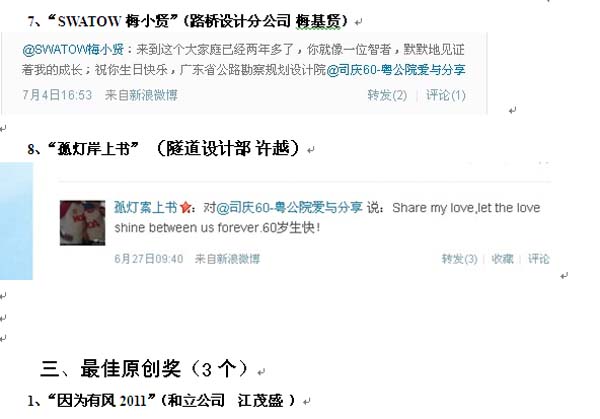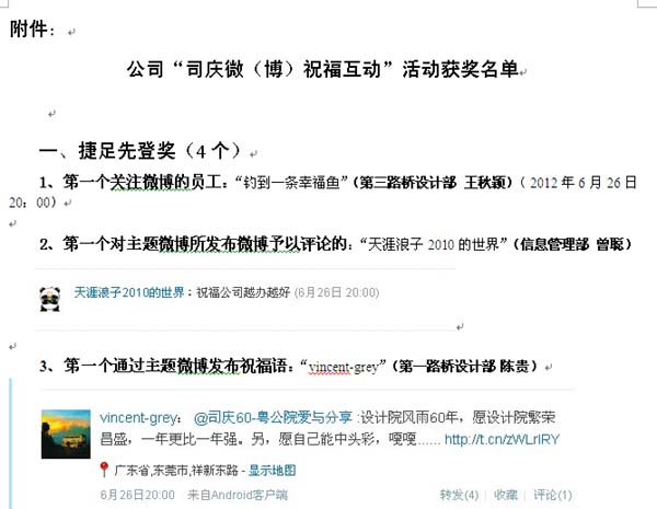 近日,公司“司庆微(博)祝福互动”活动获奖名单揭晓,“钓到一条幸福鱼”等12名员工网友荣获“捷足先登奖”、“最受关注人气奖”和“最佳原创奖”等三个奖项。本次活动得到了广大员工网友的热情参与。经过认真甄选,“因为有风2011”、“雷霆救兵”和吴兴礼等3名网友的祝福语在众多的祝福语中脱颖而出,荣获“最佳原创奖”。 “司庆微(博)祝福互动”活动7月31日结束后,公司微博继续保留,适时发布相关资讯。