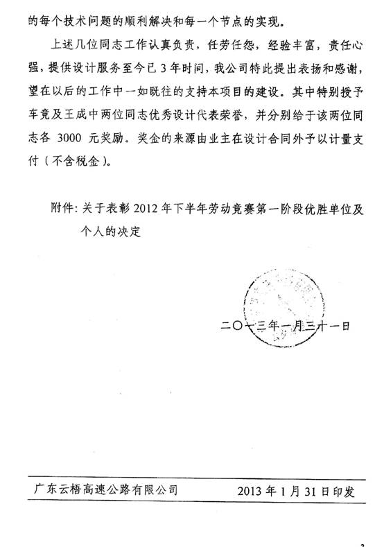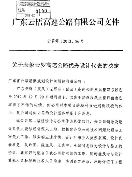 近日,广东云梧高速公路有限公司发来表彰决定,高度肯定我司的设计服务质量,并对第二路桥分公司设计代表车竞、吴玲正、庞立果、和立公司王成中和隧道部王超等人在云浮至岑溪高速公路双凤至榃滨段高速公路项目的设计后服务表示满意和感谢。其中,车竞和王成中被评为“优秀设计代表”,特表祝贺。