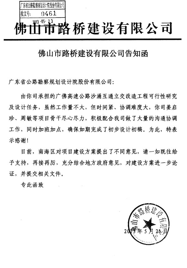 近日,佛山市路桥建设公司对我司在广佛高速沙涌互通立交改造工程可行性研究及设计工作中所做出的努力发专函给予肯定,对第一路桥设计分公司姜启珍总经理、设计师周敏等项目成员表示感谢。该项目成员竭诚服务业主的行动,为公司赢得了荣誉。