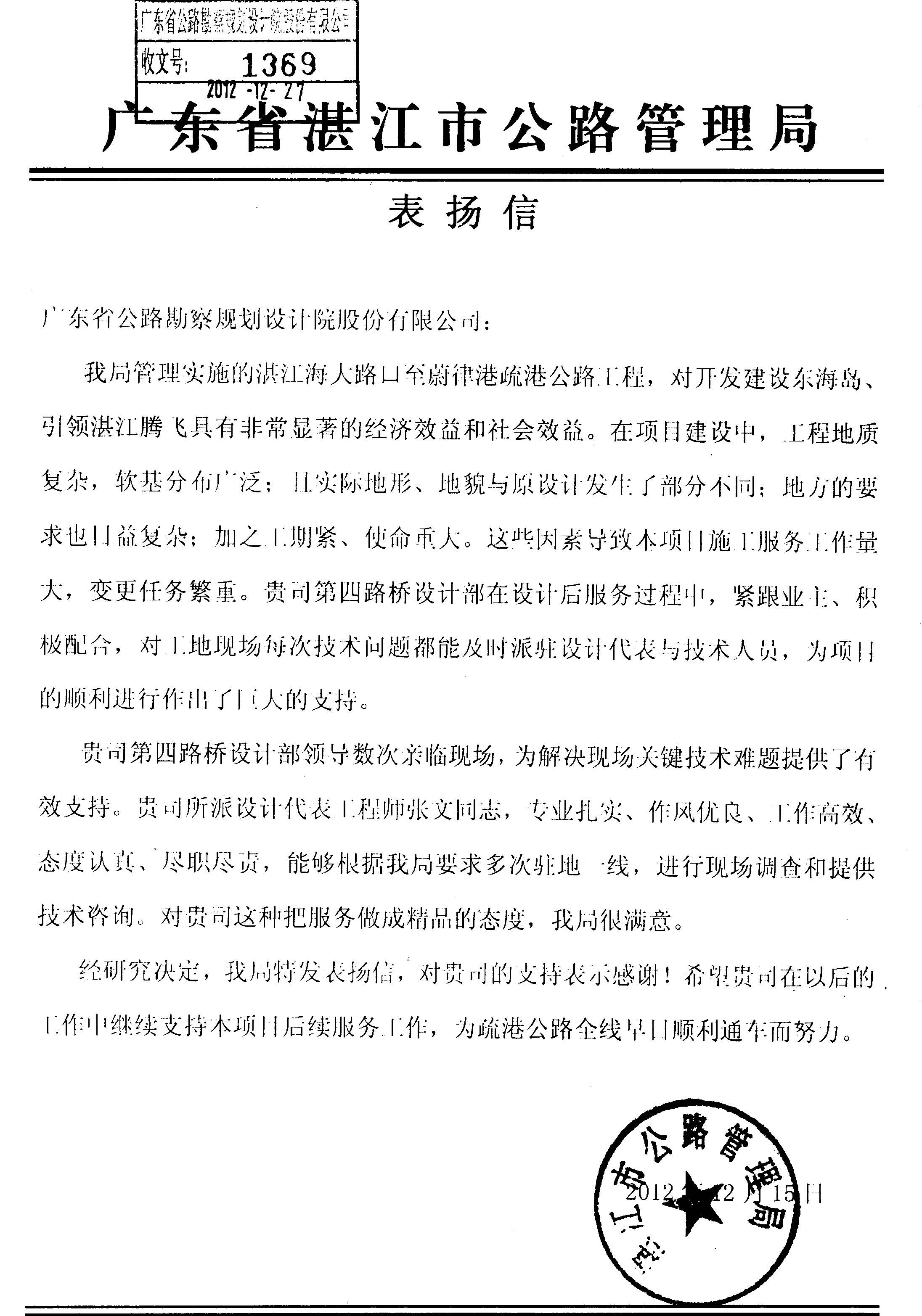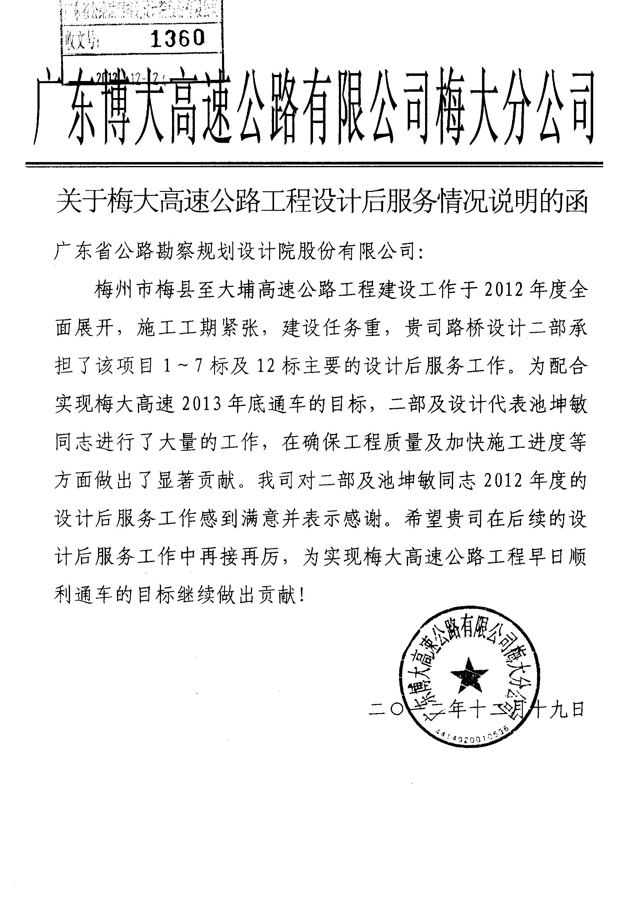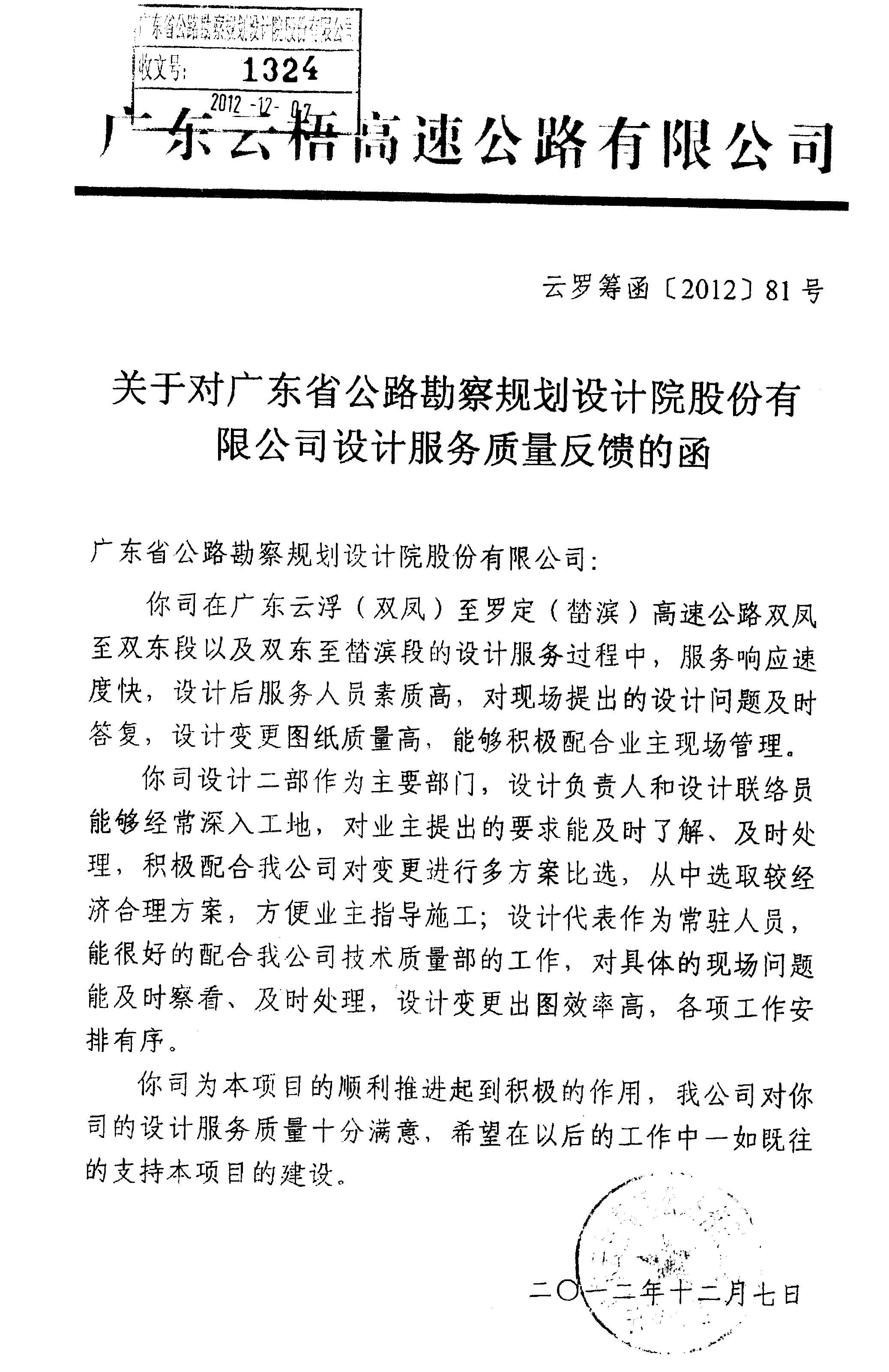 近日,湛江市公路管理局、广东云梧高速公路有限公司、广东博大高速公路有限公司梅大分公司等业主单位纷纷来信来函,对我司提供的优质的设计后服务表示满意和感谢。在设计后服务过程中,我司“服务响应速度快,设计后服务人员素质高,设计变更图纸质量高”,受到业主单位的广泛好评。