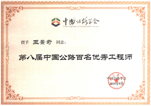 公司王景奇副总工程师近日荣获“第八届中国公路百名优秀工程师”称号,并在不久前召开的2015年中国公路学会学术年会上获得了表彰。特此祝贺!