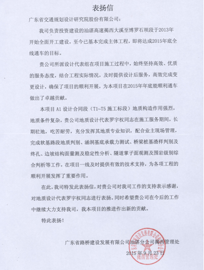 近日,广东省建设发展有限公司汕湛分公司揭西管理处发来表扬信,对我司在汕湛高速揭西至博罗石坝段中提供的专业、高效、优质服务表示赞扬,同时对负责该项目的岩土勘察分公司派驻的地质设计代表罗宇权同志给予了通报表扬。该项目已基本完成主体工程,即将达成2015年底全线通车的目标。