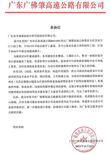 近日,广东广佛肇高速公路有限公司发来表扬信,对我司在广佛肇高速公路肇庆大旺至封开江口段工程中提供的高效、优质的设计后服务表示赞扬,同时对负责该项目的岩土勘察分公司派驻的地质设计代表赵明星同志给予了通报表扬。目前该项目已基本完成主体控制性工程,计划于2016年年底全线建成通车。
