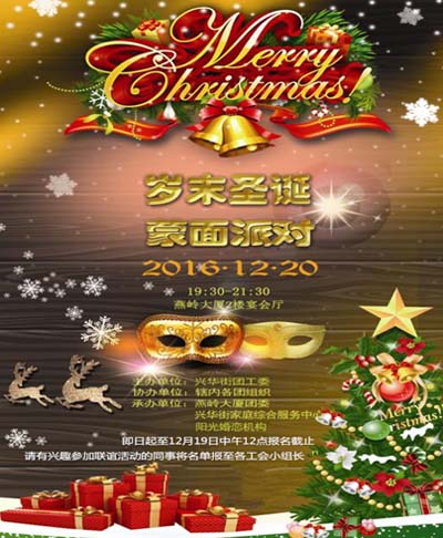 2016年12月20日晚上,由兴华街团工委主办的以“岁末圣诞•蒙面派对”为主题的单身员工联谊派对活动在燕岭大厦2楼宴会厅举行,参加活动人数共计230余名,我公司20余名员工参加了此次活动。 活动包括“有爱手牵手”、“真真假假谁懂我的心”、“传递爱情”、“爱情摩天轮”等男女协同互动任务,让大家在任务进行中同心协力,让单身男女们在游戏中、笑声中邂逅最中意的另一半。 活动丰富了员工的业余生活,拓宽了择偶、交友渠道,取得了良好的效果。