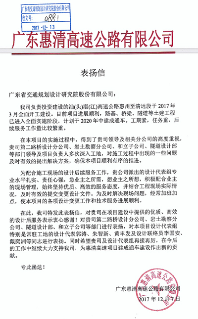 近日,广东惠清高速公路有限公司发来表扬信,对我司在汕湛高速公路惠州至清远段工程项目中提供的优质、高效的设计后服务表示肯定和感谢,对负责该项目的第二路桥设计分公司、岩土勘察分公司、和立公司、隧道设计部等部门给予了充分的肯定,对驻地设计代表郭涛、朱智新、黄丰发等给予了通报表扬,特此报喜! 该项于2017年3月全面开工建设,计划于2020年中建成通车。