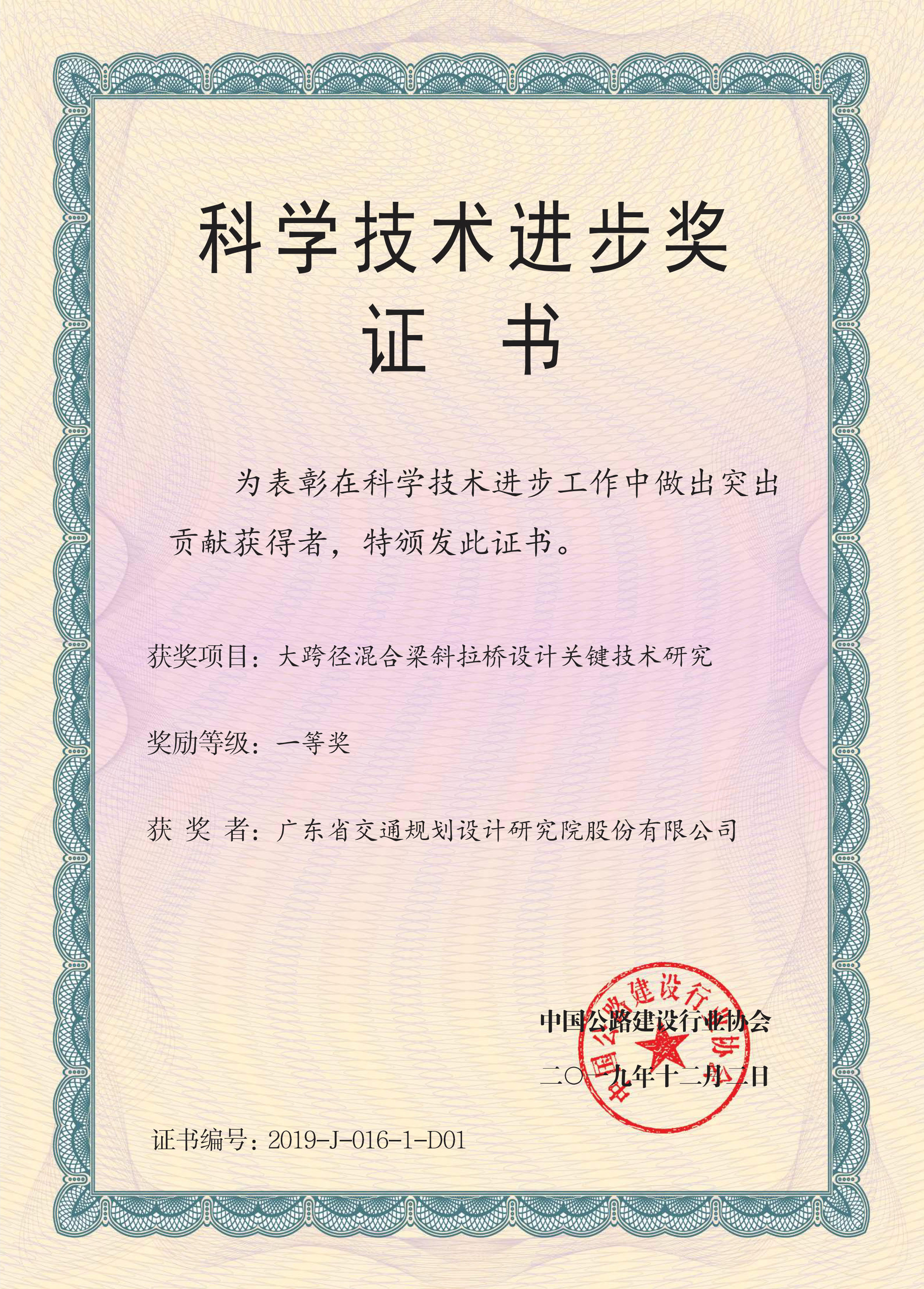近日,公司在“2019年度中国公路建设行业协会科学技术进步奖”(部级奖励)评选中喜创佳绩。“大跨径混合梁斜拉桥设计关键技术研究”等三个项目分获“科学技术进步奖”一等奖、三等奖,具体获奖及承担部门情况如下: