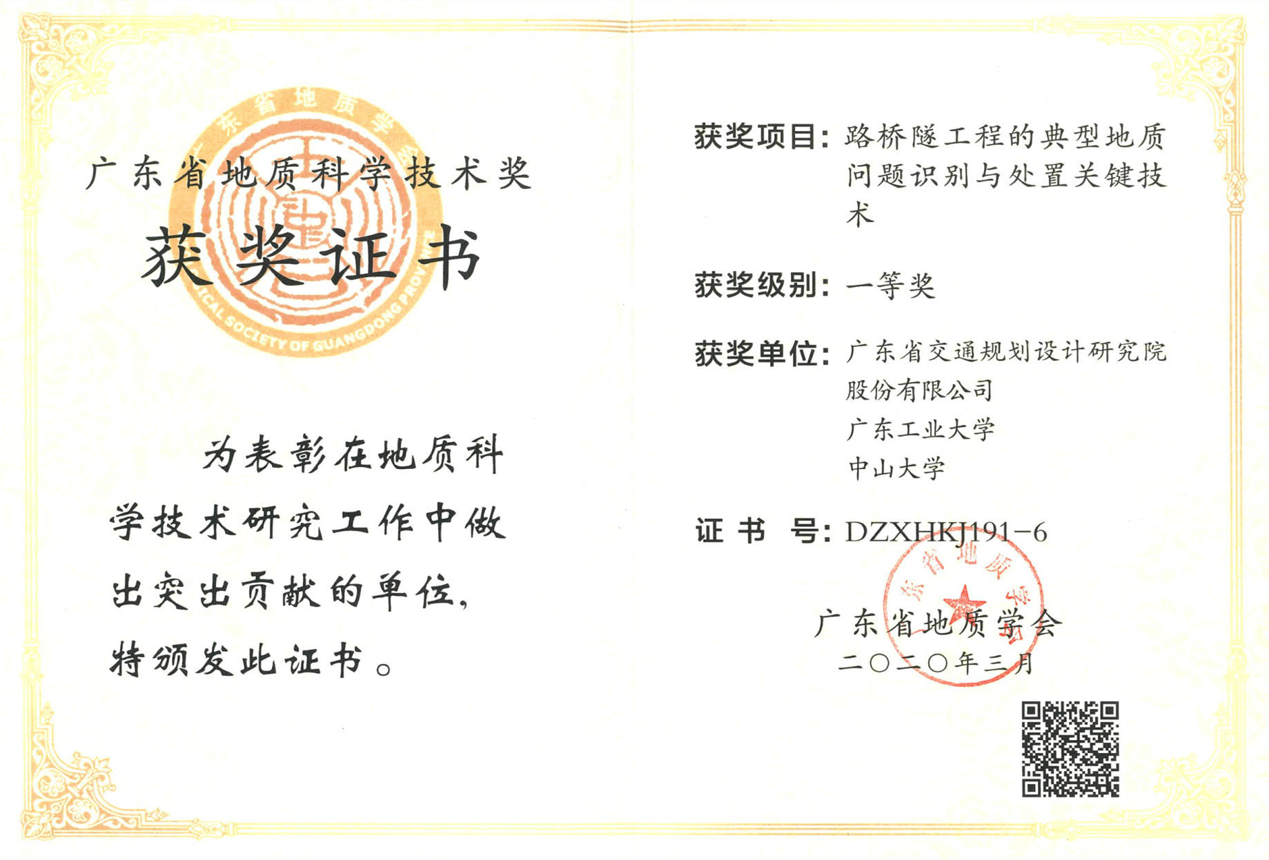 近日,公司在“2019年度广东省地质学会科学技术奖”评选中喜创佳绩。公司作为第一单位共有两个项目获奖,其中“路桥隧工程的典型地质问题识别与处置关键技术”荣获一等奖,“隧洞工程富水段地质勘察与岩土工程设计关键技术”荣获二等奖。两个获奖项目的承担部门均为岩土勘察分院。