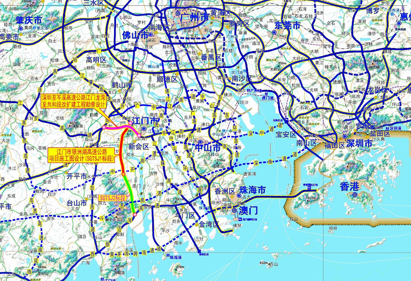 江门市银洲湖高速公路项目路线起于蓬江区棠下镇,接珠三角环线高速公路,终点位于新会区崖门镇(接西部沿海高速公路),长约53.8km,采用双向六车道高速公路标准,设计速度120km/h,路基宽度34.5m。我司承担的是银洲湖高速SGTSJ1标段(总体标)的土建勘察设计和总体协调任务。该标段全长约31.3km,总投资约82亿元。