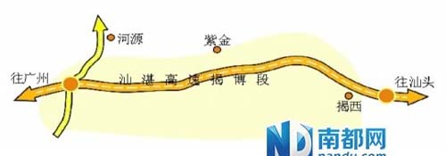 记者获悉,以从广州去汕头为例,目前自驾车一般是往东走上广惠高速,到凌坑收费站后转深汕高速,再一直走到汕头,全程接近5小时左右;但未来揭博高速通车后,全程将只需大约4小时,且可比原来线路少走约70公里的路程。
